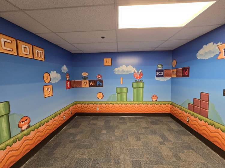 Current second-year students were recently tasked with designing, printing, and installing a series of wall murals throughout the lab and office spaces at BCIT. Students pitched design concepts and locations, with the only requirement being that they had to be large enough for tiling. Once their designs were approved, students got to work on putting together their files.