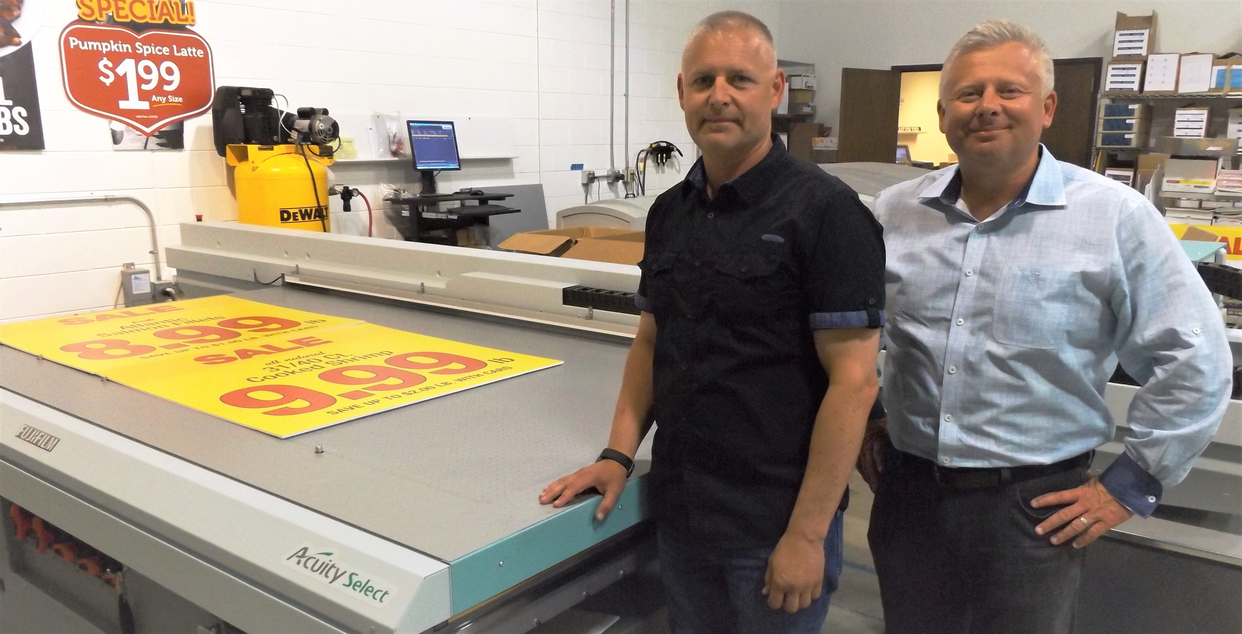 Jeff Huebner, left, operations manager, Graphicolor, and Mike Huebner, president, alongside the Acuity Select 26 wide format press by Fujifilm.