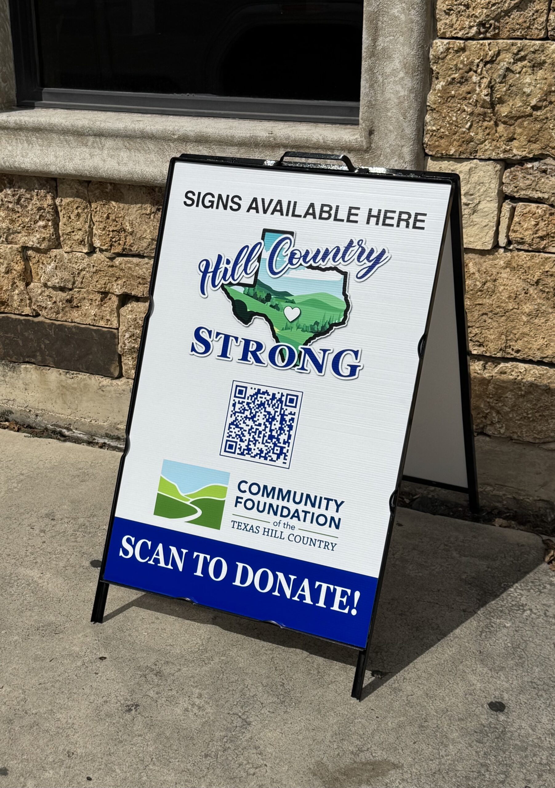 Scanning the QR code on the sign will take you directly to the donations page for the Community Foundation Texas Hill Country.