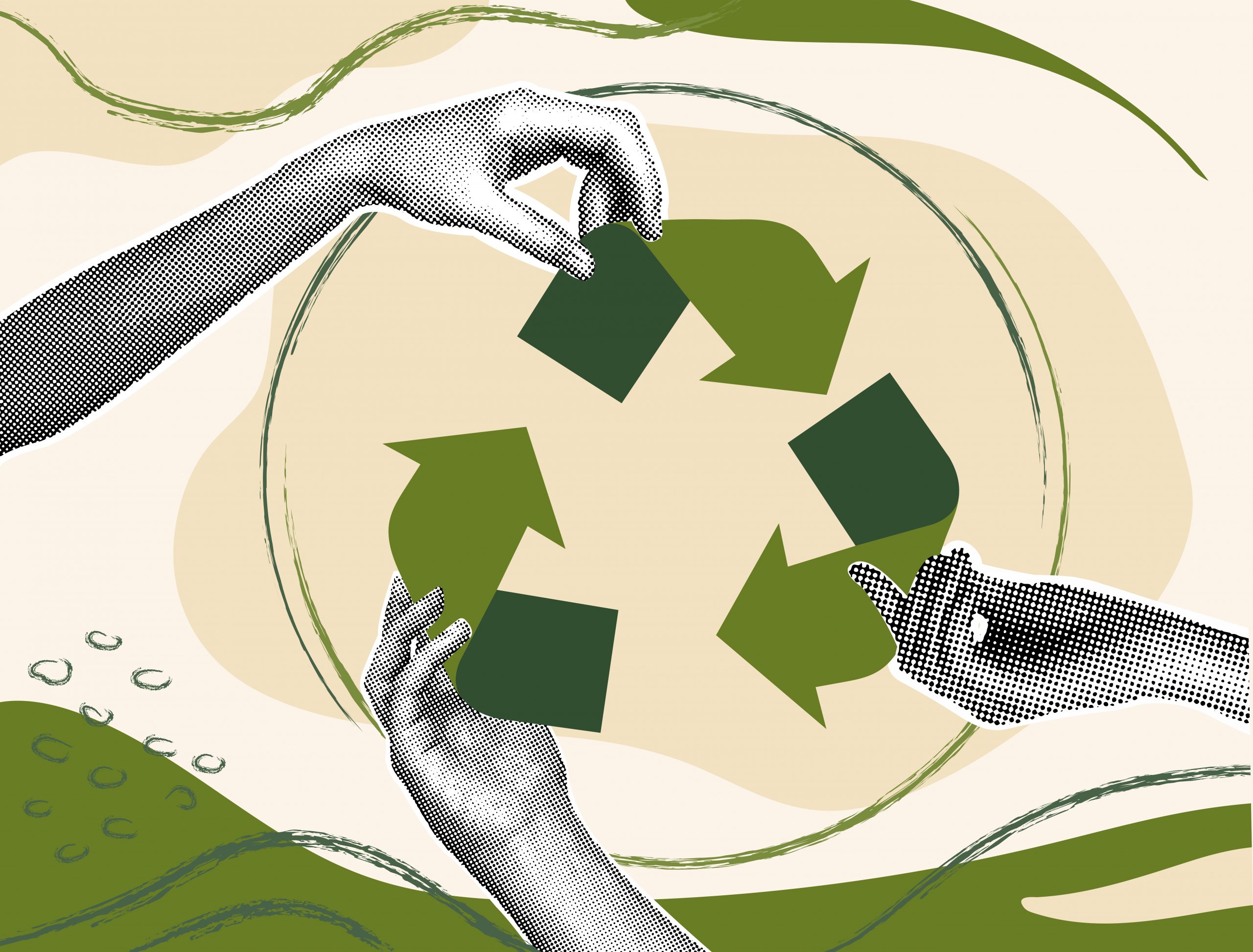 Fashionable halftone collage. Recycling concept, arrow symbol, people team. Successful strategy. Vector illustration