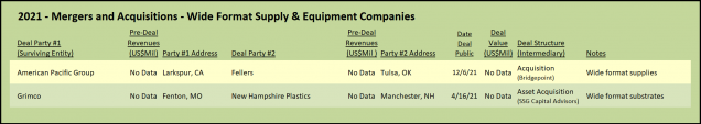 The deals involving wide-format suppliers were limited in 2021 (Figure 4). Fellers, based in Tulsa, Oklahoma — which claims to be the largest supplier of vehicle wrap substrates — was sold to private equity firm American Pacific Group.