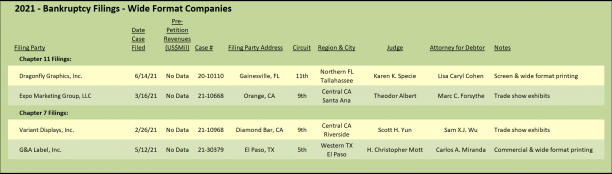 The wide-format printing segment has been amazingly void of distressed transactions and bankruptcy filings. As the wide-format industry continues to mature and specialize, cracks will begin to appear in what has generally been a bulletproof business. Consistent with that expectation, we noted four bankruptcy filings in 2020 (Figure 5). Two of the four operated primarily in the trade show graphics business, obviously an area hard hit by the pandemic.
