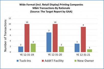 Tuck-ins, almost non-existent in the wide-format segment a few years ago, are now a regular part of the mix; however in absolute terms, there were only three wide-format tuck-ins in 2021, compared to seven in 2020 (Figure 2). In these deals, the buyer folds the acquired customers into their existing production capacity, hires selected qualified employees with a special focus on those people that touch the customer, and maybe cherry-picks some of the equipment. The seller is left to close-up shop, sell off the remaining equipment, and wind down the business entity. The result is almost always a reduction in production capacity.