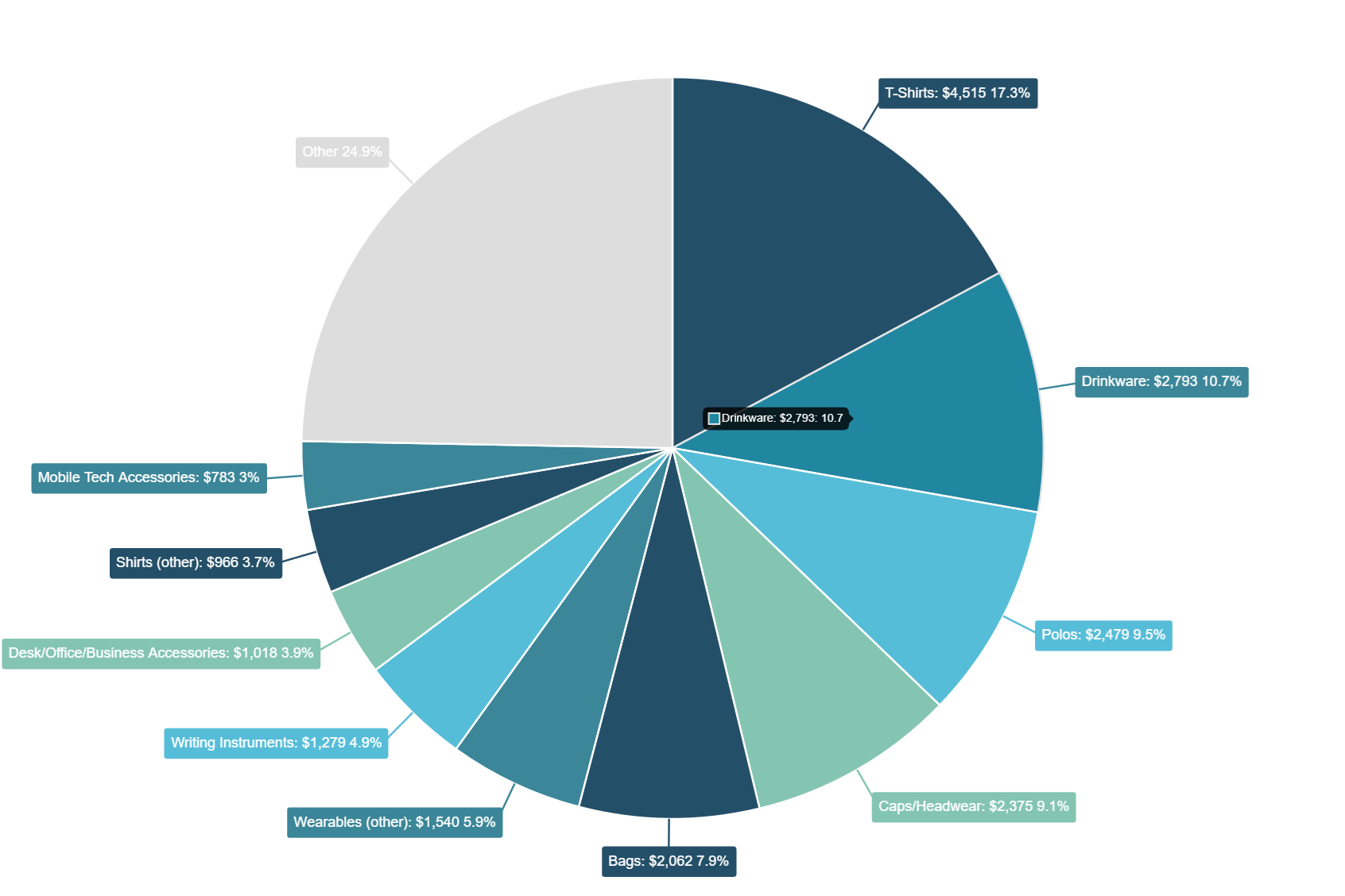 The annual revenue figure in ASI’s research includes sales of everything from branded apparel and soft goods — T-shirts, hooded sweatshirts, fleeces, polo shirts, headwear, tote bags, backpacks, and more — to what the industry commonly calls “hard goods,” which encompass categories like drinkware, writing instruments, housewares, technology items, awards, and desk/business accessories among others. In terms of revenue, T-shirts, drinkware, polo shirts, headwear, and bags are the biggest sellers, ASI Research shows.